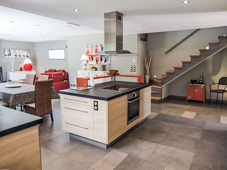 Villa 6-kamers 200 m2 op 2 verdiepingen, op het zuidwesten gelegen. Comfortabel en mooi ingericht: woonkamer met eethoek en TV (Flatscreen TV). Uitgang naar het terras. 1 kamer met 1 2-pers bed, bidet en douche. Uitgang naar het terras. 1 kamer met 1 2-pers bed en douche. Open keuken (oven, afwasmachine, 4 inductiekookplaten, broodrooster, waterkoker, magnetron, diepvriezer, elektrische koffiemachine, pads voor de koffiemachine (senseo) extra). Uitgang naar het terras. 2 aparte WC's. Air-conditioning. Bovenverdieping: 2 kamers, elke kamer heeft 1 2-pers bed en air-conditioning. Uitgang naar het balkon. Douche, aparte WC. Ter beschikking: wasmachine, droger, strijkijzer, haardroger. Internet (WiFi, gratis). Rookmelders.