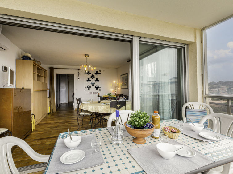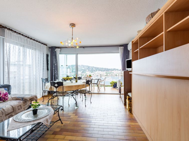Appartement 2-kamers 50 m2 op de 4e verdieping, op het zuidoosten gelegen. Eenvoudig en rustiek ingericht: woon-/eetkamer met 1 2-pers kastbed (1 x 140 cm, lengte 190 cm), TV en air-conditioning. Uitgang naar het terras. 1 kamer met 1 bed (140 cm, lengte 190 cm). Kookhoek (afwasmachine, 1 keramische glas kookplaat, 4 kookpitten (vlammen), broodrooster, waterkoker, magnetron, diepvriezer, elektrische koffiemachine). Bad/WC. Elektrische verwarming. Terras 10 m2. Terrasmeubelen. Uitzicht op zee, het zwembad en de tuin. Ter beschikking: wasmachine. Internet (Internet (WiFi), gratis). Parkeerplaats. Niet rokers woning. 1 klein huisdier/hond toegestaan. Rookmelders. Aanbod door een particulier volgens art. 155, IV van CGI. 83115003222AK