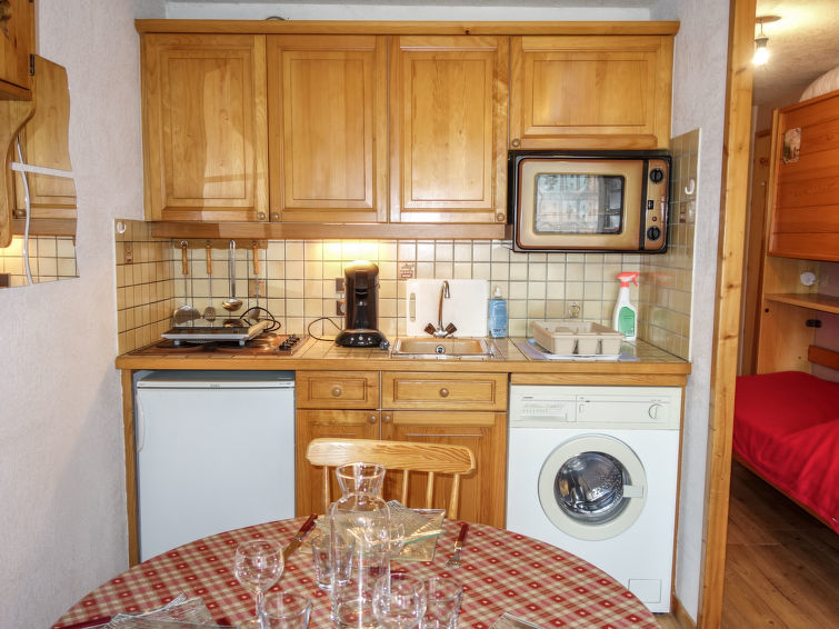 "La pointe des Aravis 3", studio 1-kamer 20 m2 op de 1e verdieping. Hal met 1 opklapbed (90 cm, lengte 190 cm). Woon-/eetkamer met 1 2-pers divanbed (140 cm), TV en Flatscreen TV. Uitgang naar het balkon. Kookhoek (mini-oven, broodrooster, waterkoker, elektrische koffiemachine). Badkamer, aparte WC. Elektrische verwarming. Balkon, op het noorden gelegen en op het oosten gelegen. Mooi uitzicht op de bergen. Ter beschikking: wasmachine. Internet (WiFi, extra). Niet rokers woning. 1 klein huisdier/hond toegestaan. TV alleen FR. Rookmelders, geen lift.