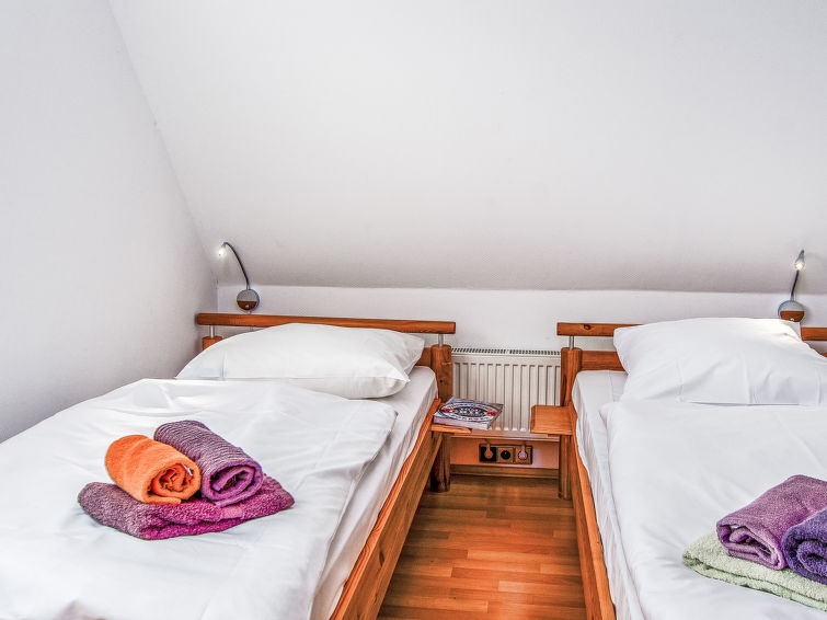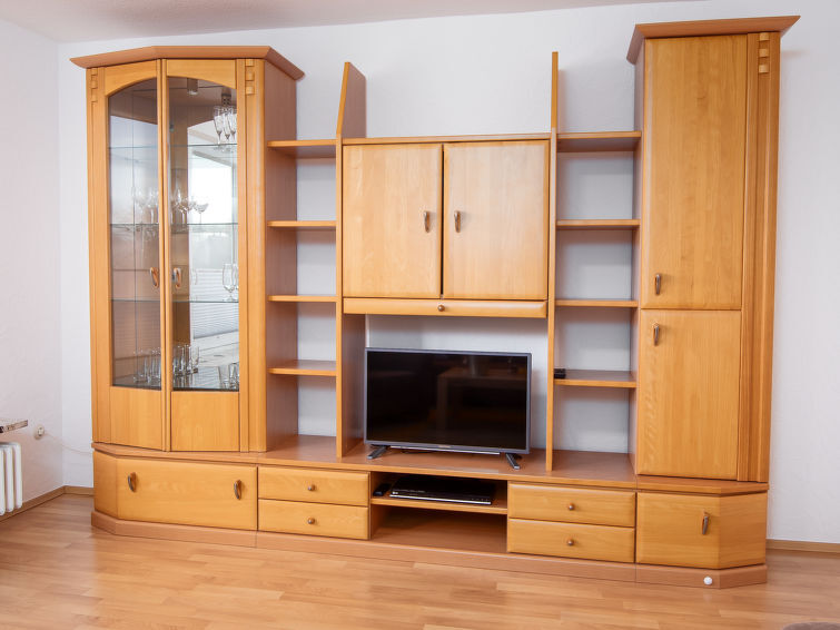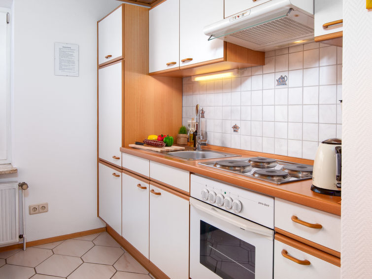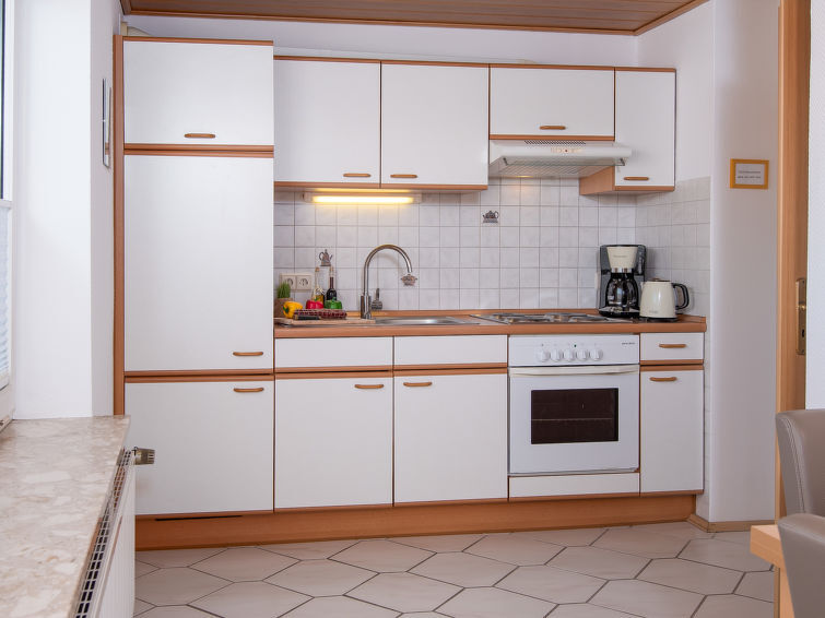 "Ferienwohnung Schäfer", appartement 3-kamers op de 1e verdieping. Gedeeltelijk afgeschuinde daken, gezellig ingericht: woonkamer met Kabel-TV (Flatscreen TV). 1 kamer met 1 2-pers bed. 1 kamer met 2 bedden. Keuken (4-pits kookplaat, oven, broodrooster, waterkoker, elektrische koffiemachine) met eettafel. Uitgang naar het balkon. Douche/WC. Balkon 25 m2. Balkonmeubilair. Niet geschikt voor kinderen onder 6 jaar. Niet rokers woning. Rookmelders.