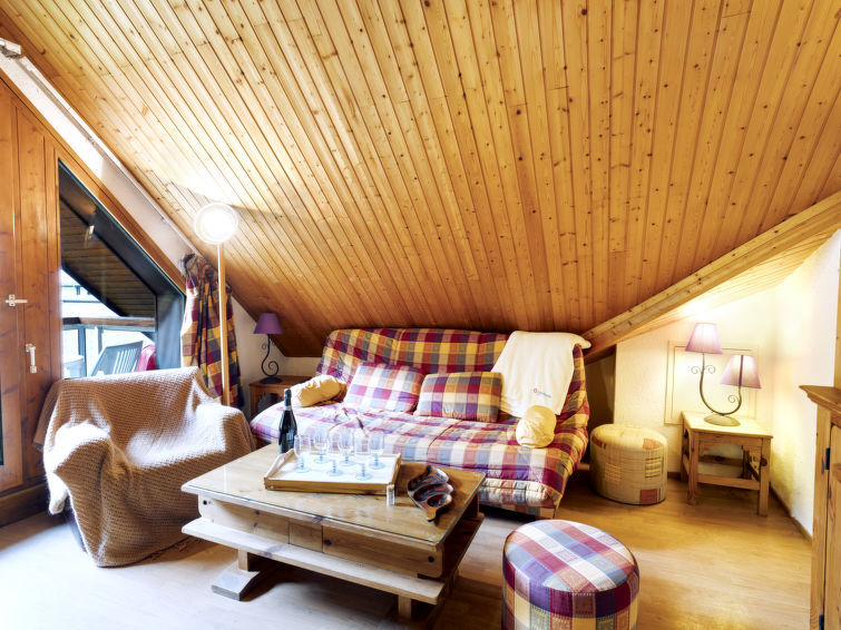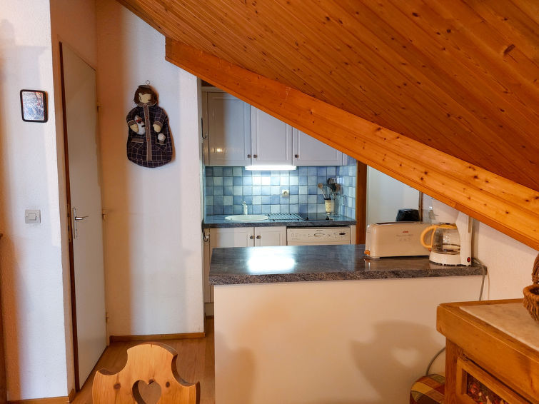 Dakappartement 2-kamers 48 m2 op de 4e verdieping. Afgeschuinde daken, comfortabel ingericht: woon-/eetkamer met TV en radio. 1 kamer met 1 2-pers bed (160 cm). Cabine met 1 2-pers bed. Kookhoek (2-pits kookplaat, afwasmachine, broodrooster, waterkoker, magnetron, grill, elektrische koffiemachine, raclette oven, fondue Set (kaas)) met doorgeefluik. Douche, aparte WC. Elektrische verwarming. Balkon, op het westen gelegen. Ter beschikking: Internet (WiFi, extra). Parkeerplaats nr. 1301 (overdekt). Rookmelders. In plaats van een afgesloten slaapkamer bevinden sommige slaapgedeeltes zich in een open ruimte (galerij, nis, etc.). 74085 000465 KU